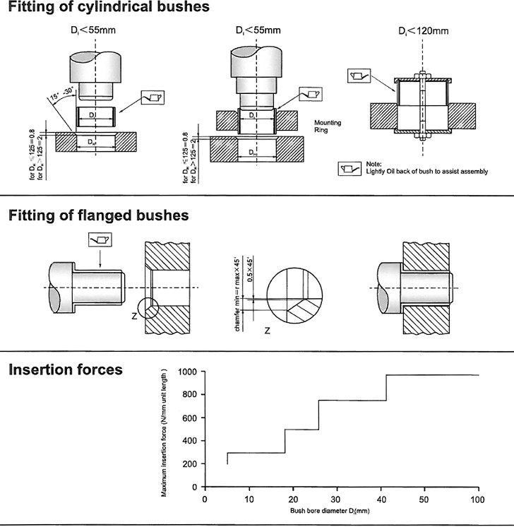 Straight bushings should have chamfers on the housing bore during assembly. A chamfer with a size fg, and an angle of 20?±5? is important to facilitate the pressing of the bushing into the housing.