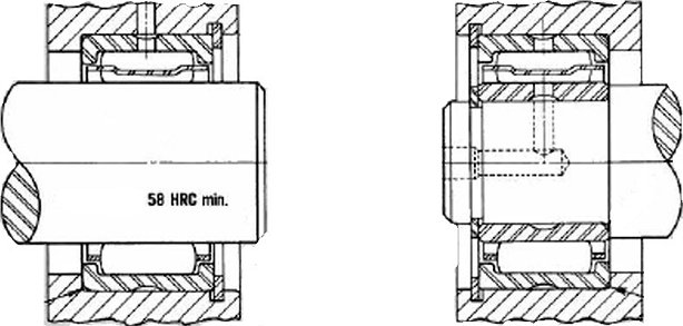 To utilize bearing capacity fully, uniform load distribution must be maintained over the entire contact length of the rollers. Therefore, the designer must consider shaft deflection as well as bearing capacity. To achieve maximum bearing life, the shaft slope through the bearing should not exceed .0015" per inch (15 µm/cm) for shafts up to and including 2" (50 mm). Do not exceed .0010” per inch (10µm/cm) for shaft sizes from 2" to 3". For larger sizes, .0005" per inch should not be exceeded. When the shaft is used as the inner race, it must be at least surface hard with a reasonable core strength. Any hardening method may be used that produces a minimum surface hardness of HRc58 when tested. If this hardness cannot be obtained, the bearing's capacity is limited.